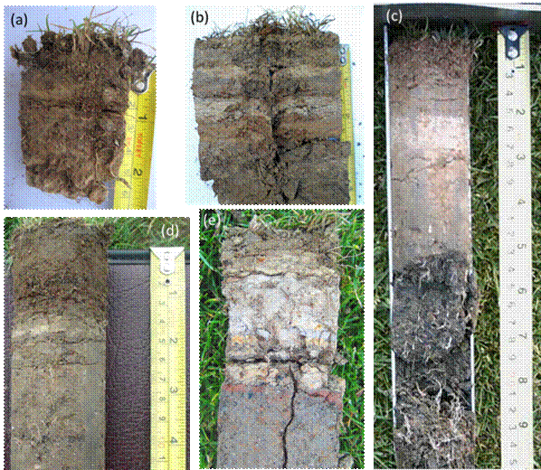 Figure 2 Identifying problems from cores. (a) This core has two rootbreaks where roots are growing horizontally (at 10 mm and 20 mm). (b) a 'barcode' pitch profile where different loams have been used over different years to dress the pitch. Different loams shrink and swell by different amounts so breaks are caused. (c) this core has two loams (with a boundary at about 40 mm). (e) another barcode profile with different loams used on an almost annual basis; note how there are a number of horizontal breaks in the profile. (f) Another layered profile but with good deep rooting down to 240 mm depth.