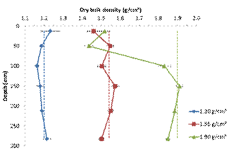 This has an interesting effect on density. Figure 6 shows how at 1.20 g/cm3 the original packing density is not affected. At 1.55 g/cm3 original density there is some reduction of density near surface but at 1.9 g/cm3 there is a significant reduction in density near the surface where the roots can exploit any soil porosity and reduce soil density. Immediately this creates a 50 mm layer of lower density soil over a higher density base (>100 mm).