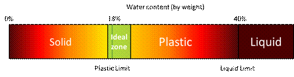 Figure 1 This diagram shows how the consistency of a soil will change from solid to plastic to liquid as the water content is increased. At the plastic limit, the soil will change from failing elastically to failing plastically – what this means is that it stops crumbling and shattering and starts to mould and flow. At the liquid limit the soil has no yield stress – that means it will flow under its own weight, like liquid water. The actual values for the plastic limit and liquid limit presented here are for Ongar Loam, other loams will have similar but slightly different limit values. The ideal zone represents the range of water contents at which the soil is in an ideal consistency for solid tine aeration in cricket pitches, i.e. it is not too solid and not too plastic. This range of water contents is very small in cricket loams.
