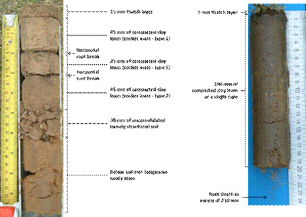 Figure 1 Left: a core taken from a poorly performing pitch showing a thatch layer and two root breaks the first one within the same loam and the second one between two layers of different loam. Further down the profile there is a loosely structured layer of loam interfacing with the indigenous soil (sandy loam). Photo courtesy of Chris Wood © ECB 2012. Right: a core taken from a trial pitch at Cranfield University three years after construction. There is a small thatch layer forming already but at less than 5 mm does not affect ball bounce. The core comprises 190-200 mm of uniformly structured clay loam of a single type. The pitch was constructed in approximately 50 mm layers possibly corresponding to the horizontal cracks at 55, 100 and 140 mm, however these do not affect root growth which exceeds the length of the core.