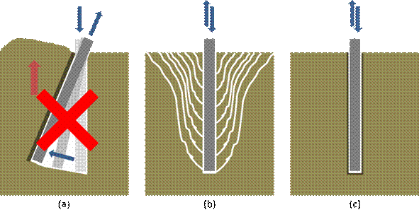 Figure 1 Solid tine effects on cricket pitches. It is essential to ensure that the tine enters and exits the soil on the same axis and that this axis is vertical. If the tine is rotated in the soil as shown in (a) then surface disruption will occur – machines should be set up to ensure that heave is avoided and that tines enter and exit the soil vertically. (b) shows an ideal creation of fractures as a result of using a vertical solid tine. Commonly, this does not take place because in order to create these fissures the soil needs to be dry enough to achieve brittle failure but in this condition it is too hard to achieve tine penetration to full working depth. The situation in (c) is more common where the soil is wetter to achieve penetration but then fails plastically – with localised compaction around the tine hole. This compaction must breakdown through shrink and swell action before the tine hole is fully functional.