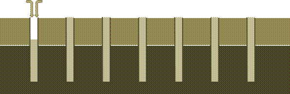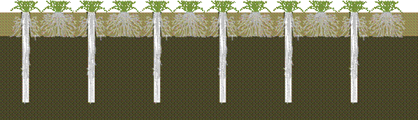 Figure 2 Illustration of the effect of deep drill /vertical solid tine on grass rooting in a soil that is dense at depth. Roots exploit the channels created by the drill /tines, surrounding plants unable to access these channels remain rooted in the less dense upper layers.