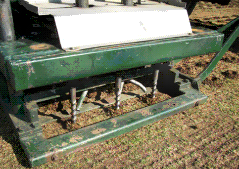 Figure 3 Deep drill aerator (side view). Note the spoil left by the machine (right) which needs to be cleared prior to topdressing.