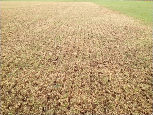 Figure 2 Deep scarification (with arisings removed). Note how only a limited amount of thatch is removed with each pass - this is because to remove all thatch would require complete cultivation of the surface which is not desirable in an annual maintenance regime.