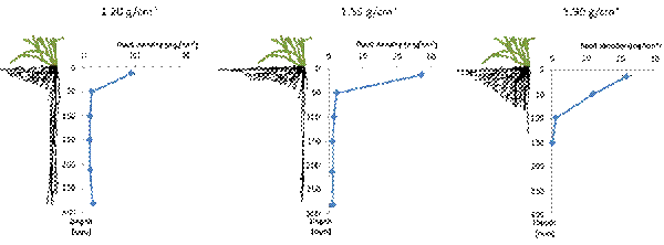 The total mass of roots in the soil is actually similar it is the depth of rooting that decreases with increasing soil density. Grass roots will grow and establish in a high density (1.90 g/cm3) soil, it is just that they are all in the top 75 mm of the profile. Near-surface roots dominate at lower densities but the quantity of roots at depth increases as the soil bulk density decreases. In high density soils the plant cannot physically break through to lower depths so it increases near-surface rooting to compensate.
